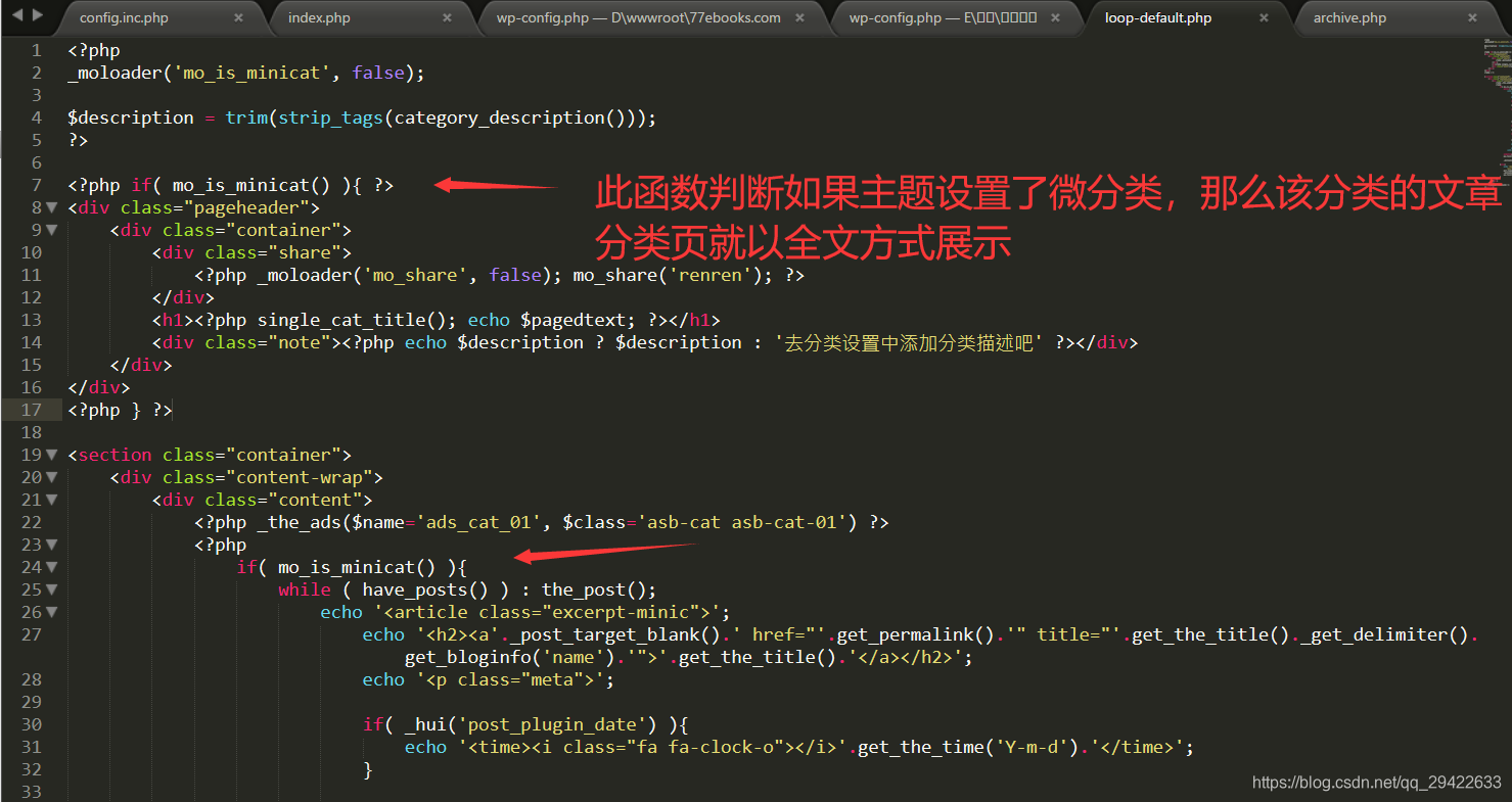 然后,我百度了一下,结果居然没有人写这个问题的解决方法,难道大家都是大神?还是我太水了?好吧,我承认我只接触wordpress几天。我又查看dux的代码,然后,定位了问题在模板文件 loop-default.php中,查看发现是一个叫 mo_is_minicat()函数做了判断。