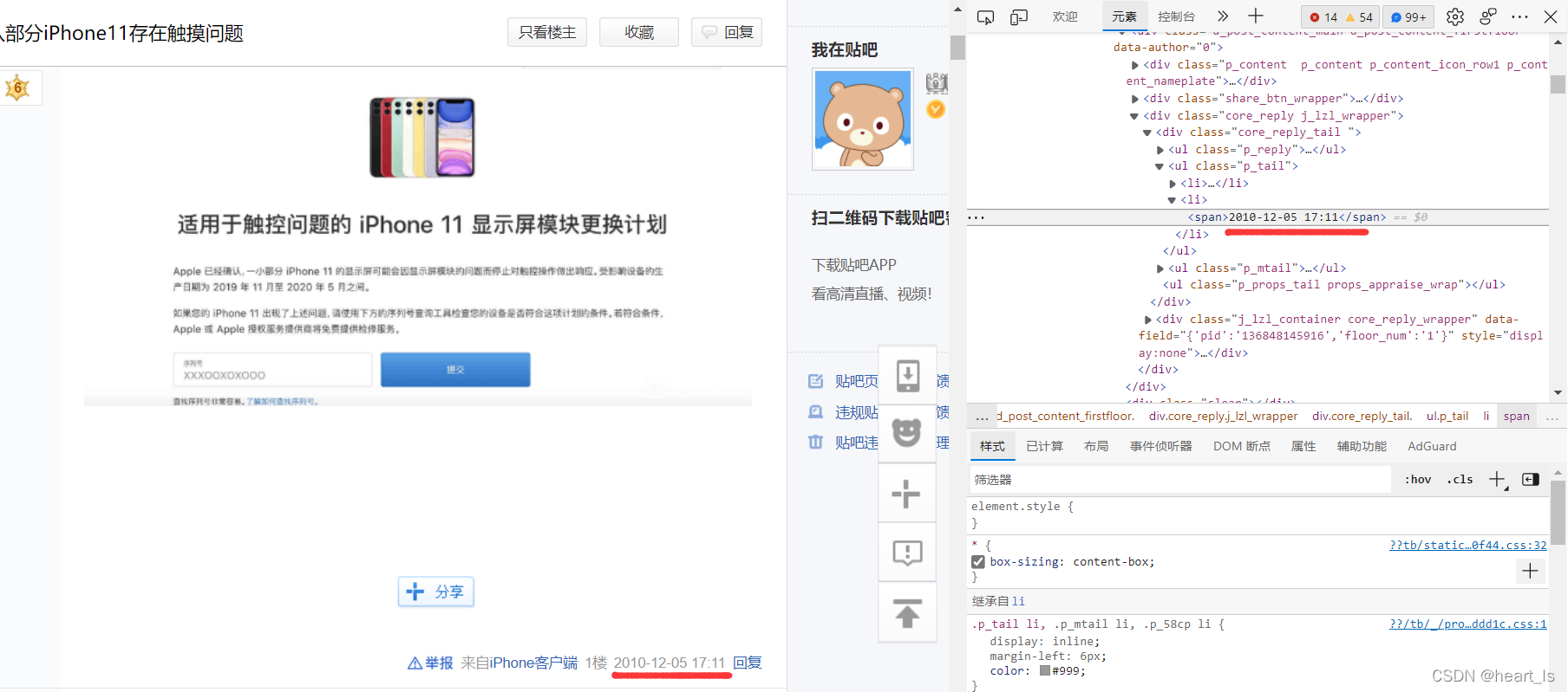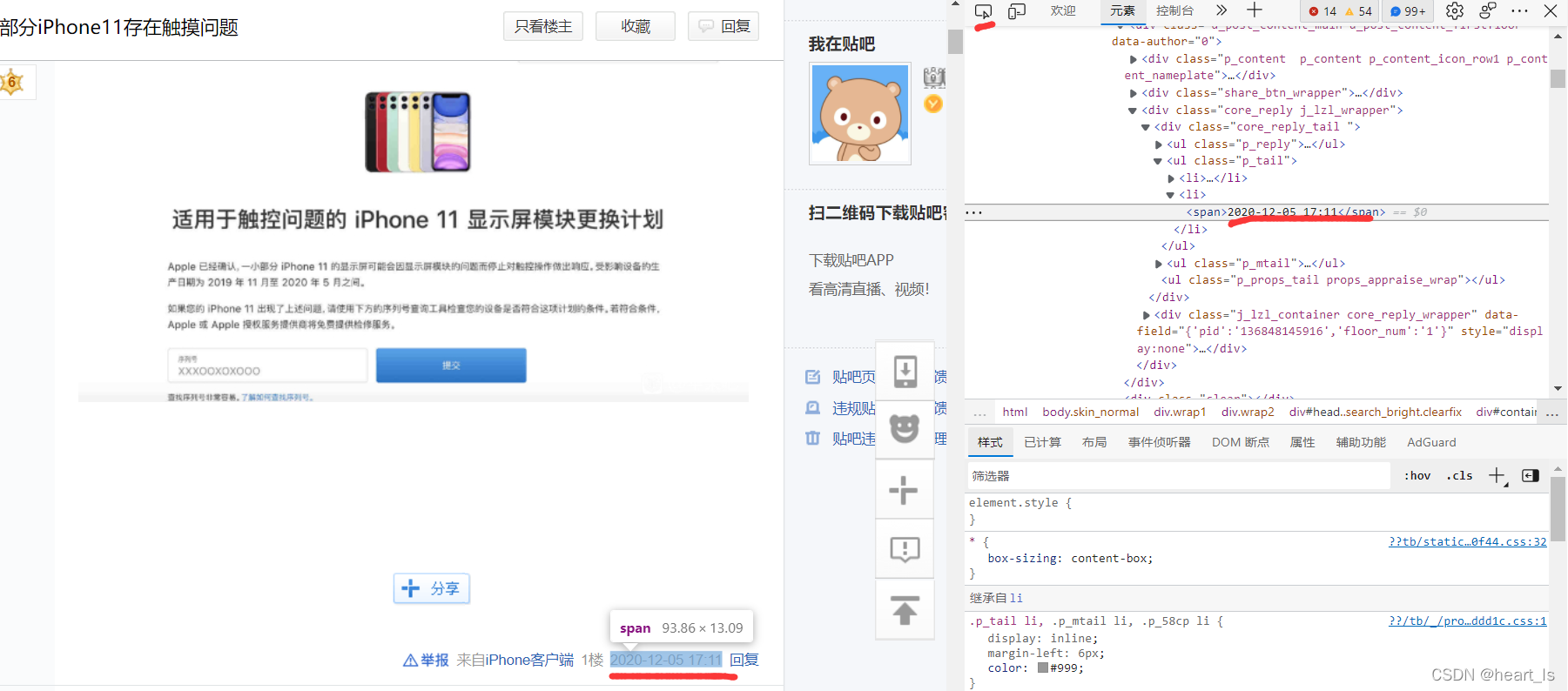 首先按F12进入浏览器的开发者模式,然后用定位指针定位到贴吧中的日期位置,定位到元素框中列表里的span标签,随后双击即可修改日期,回车即可实现下图效果