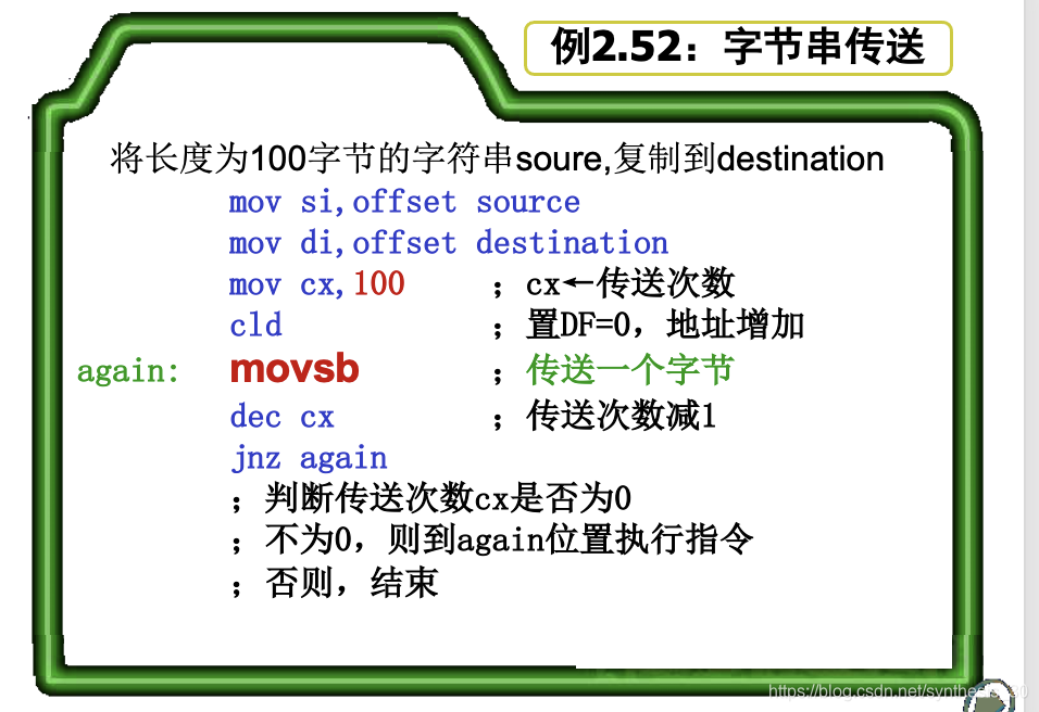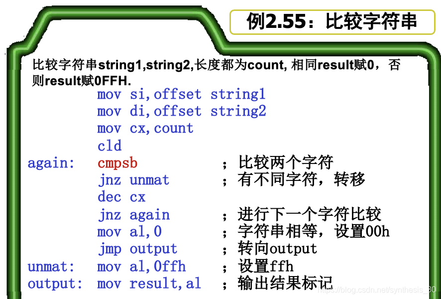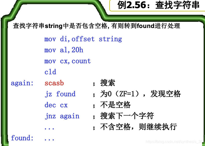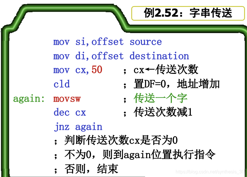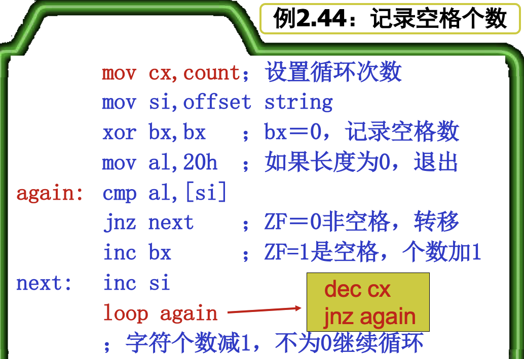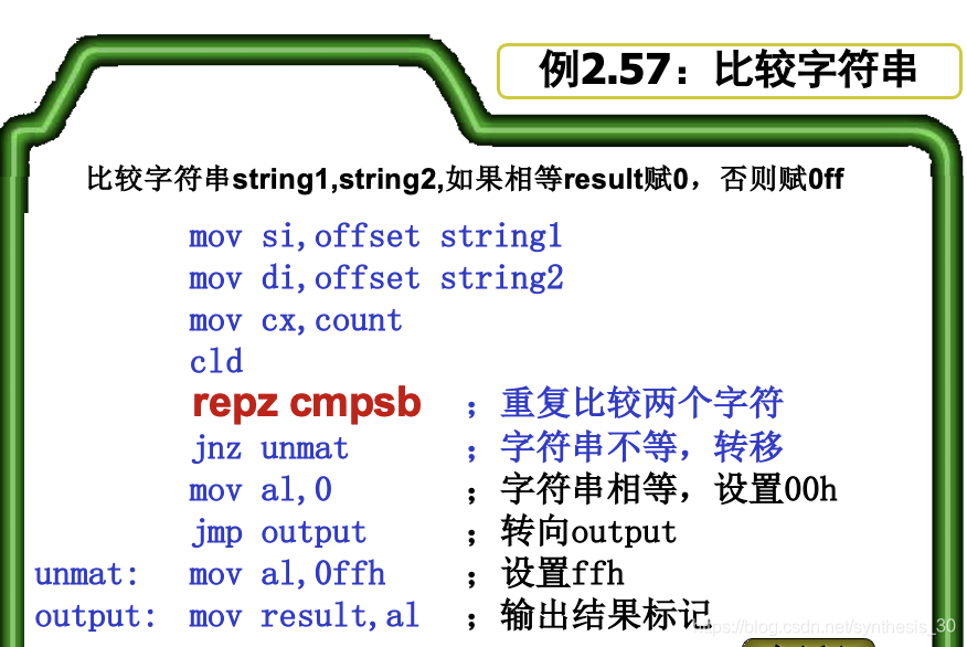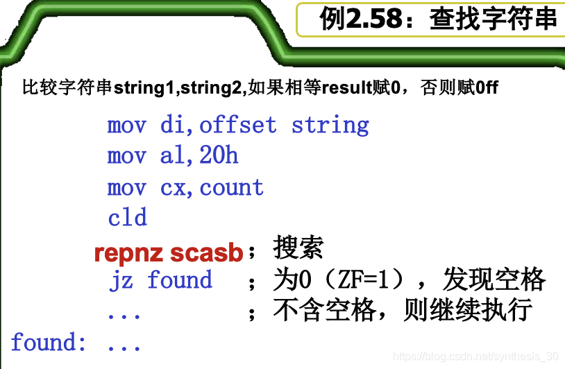 定义:每执行一次串指令CX-1,并判断ZF是否为1,只要CX=0或者ZF=1,重复执行结束