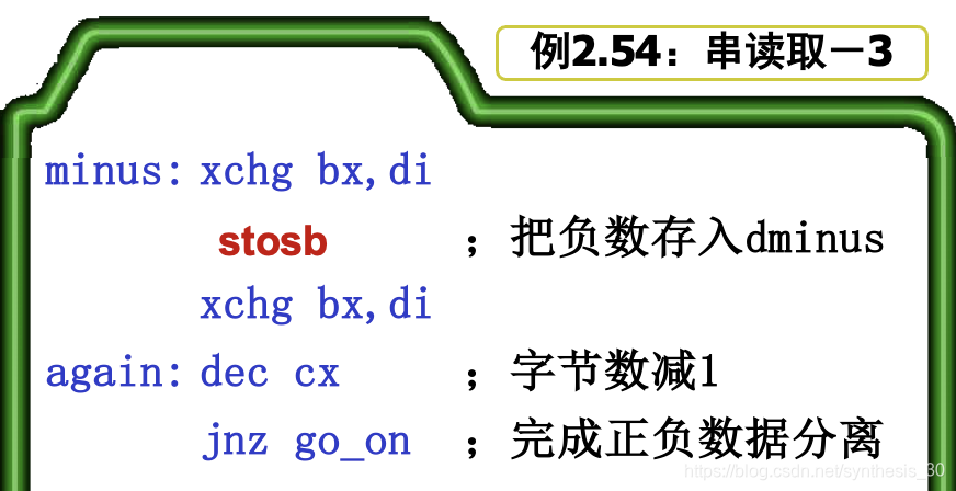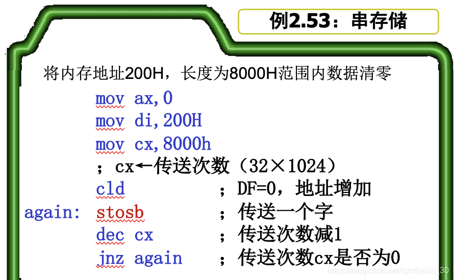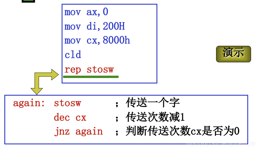 定义:每执行一次串指令CX-1,并判断ZF是否为0,只要CX=0或者ZF=0,重复执行结束
