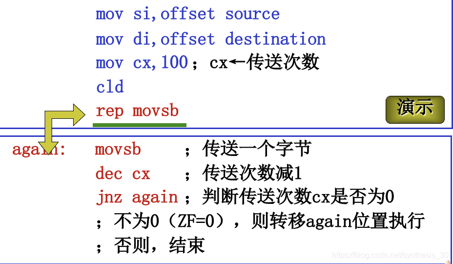 REP前缀可以理解为:当数据串没有结束(CX!=0),则继续传送