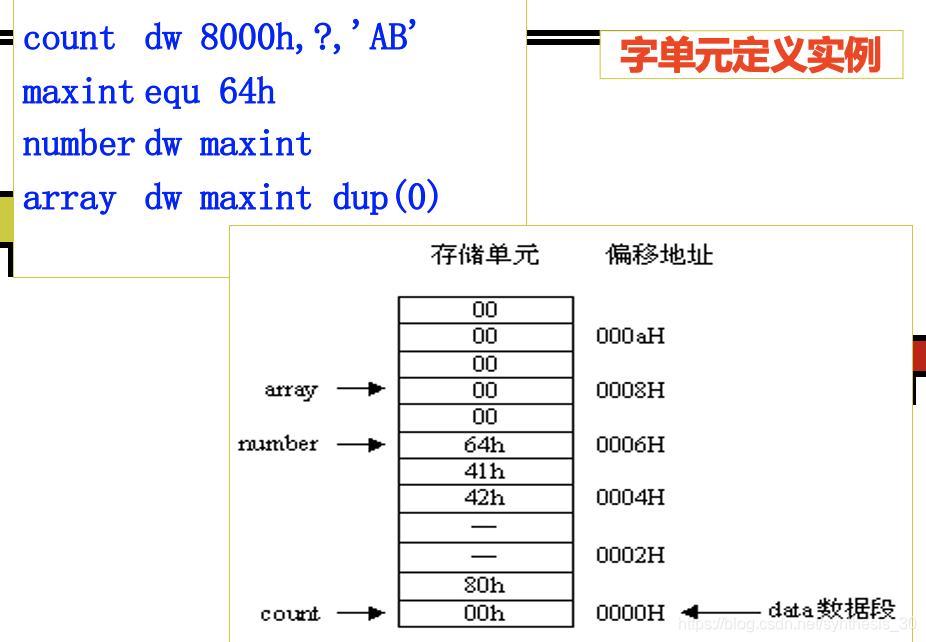 伪指令:不产生CPU动作,再程序执行前由汇编程序处理的说明性语句,例如:数据说明变量定义