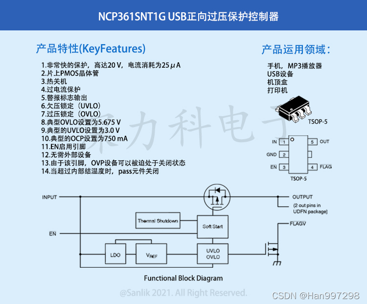 本文主要是介绍NCP361SNT1G 带内部 PMOS FET 和过电流保护 USB 正向 过电压保护电路,希望对大家解决编程问题提供一定的参考价值,需要的开发者们随着小编来一起学习吧!