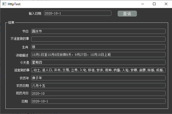 本篇介绍用libcurl获取http数据,例如,我做了一个万年历,输入日期就可以得到当天的信息,界面如下: