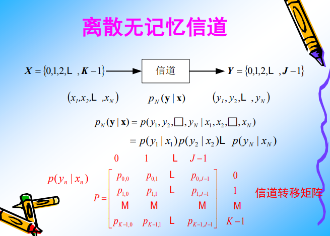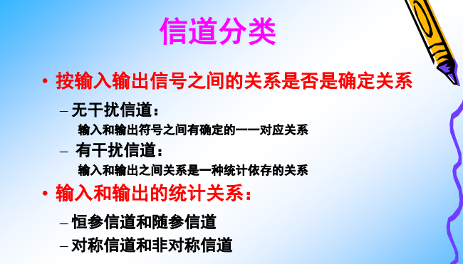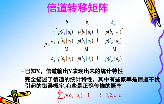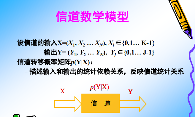 - 如果输出与输入的关系不是完全确定的,那这种信道就是有损信道,是有干扰信道,是不确定性信道,信道就存在一定的误码率,信道本身是包含了一定的信息量。这是信息研究的重点,