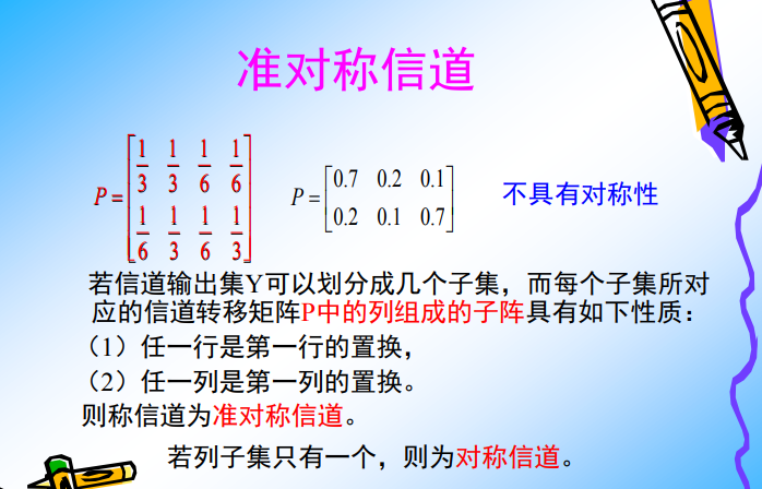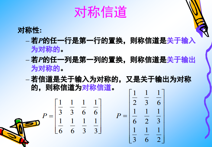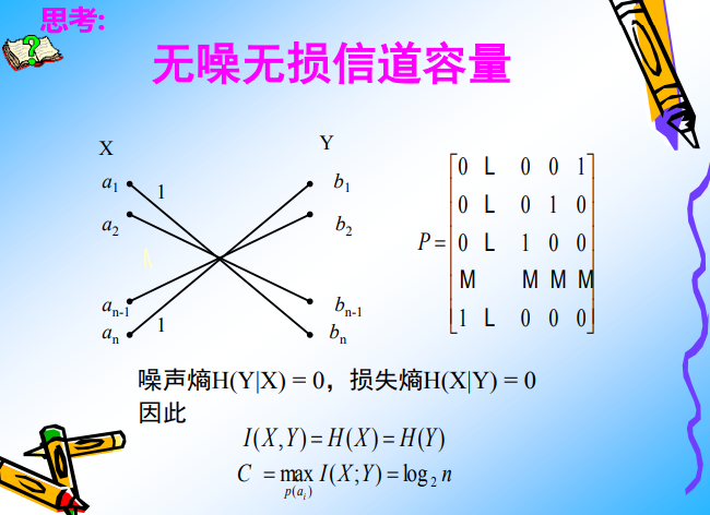 - 如果输出与输入的关系是完全确定的,那这种信道就是无损信道,是无干扰信道,是确定性信道,信道本身是无信息量的。