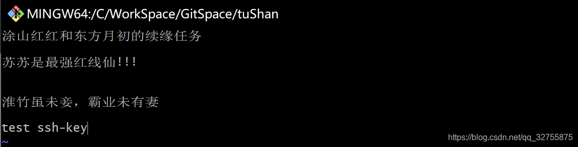 - 回到Git Bash,先对文件做出修改,加上一行test ssh-key,然后提交到本地库