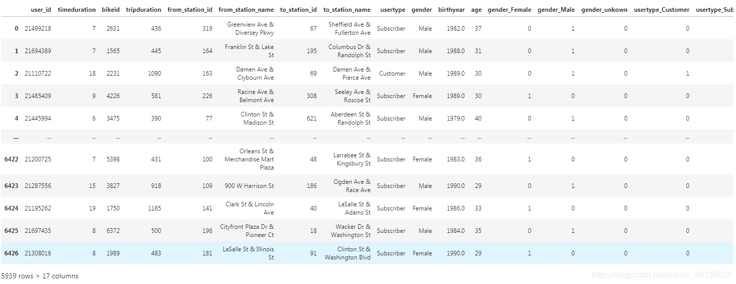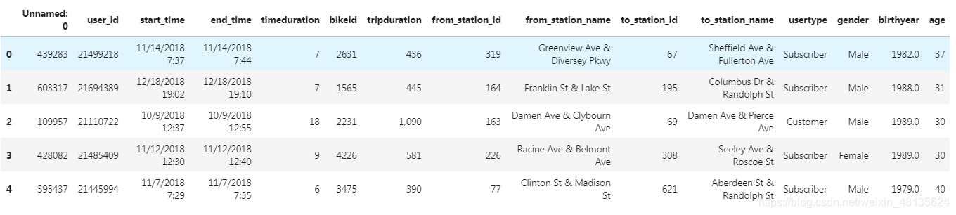 Index(['user_id', 'timeduration', 'bikeid', 'tripduration', 'from_station_id','from_station_name', 'to_station_id', 'to_station_name', 'usertype','gender', 'birthyear', 'age'],dtype='object')#pd.concat实现数据合并 ,传入的第一个数据是预处理的数据。