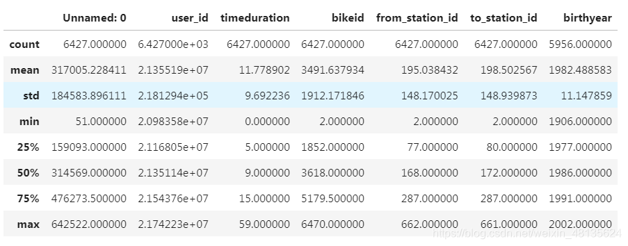 memory usage: 753.3+ KBmobike.describe() #结果的索引将包括计数,平均值,标准差,最小值,最大值以及较低的百分位数和50。