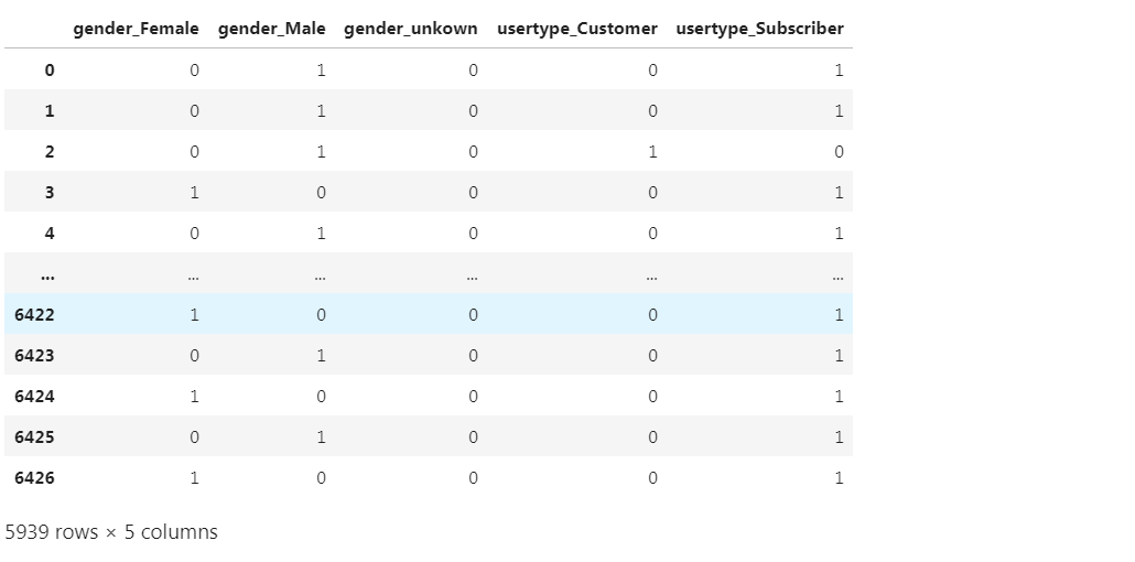 pd.get_dummies(mobike_) #可以分别做哑变量转换,也可以放在一起.此时把这两列做一个哑变量矩阵#将类别性别转化成哑变量(gender)