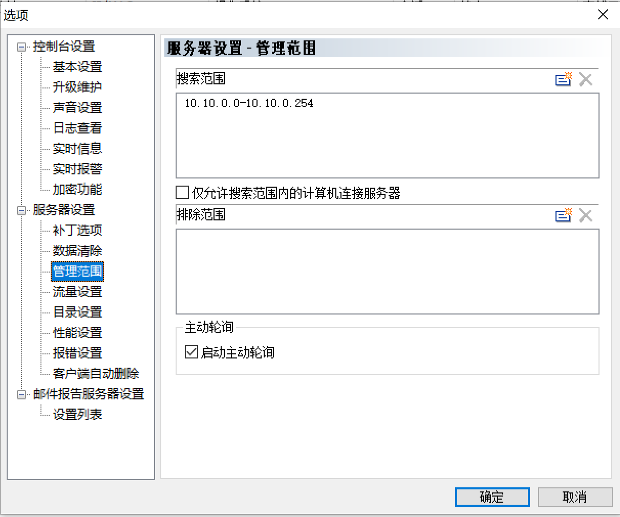 或者在服务器参数中设置管理范围,启用主动轮询,过程比较慢,客户端很长时间才会上线。