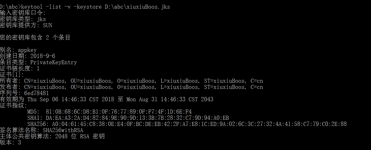 D:\abc> keytool -list -v -keystore D:\abc\xiuxiuBoos.jks