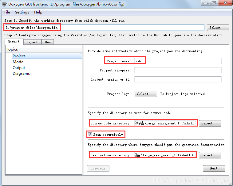 打开后如下图所示,圈住的都是要填的,上面2个随便填。源文件目录填你想解析的程序源代码目录,在下面那个递归解析选项根据你的实际情况选择是否勾选,在最下面的目标目录是你想把生成的文件放在那里。
