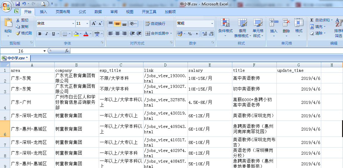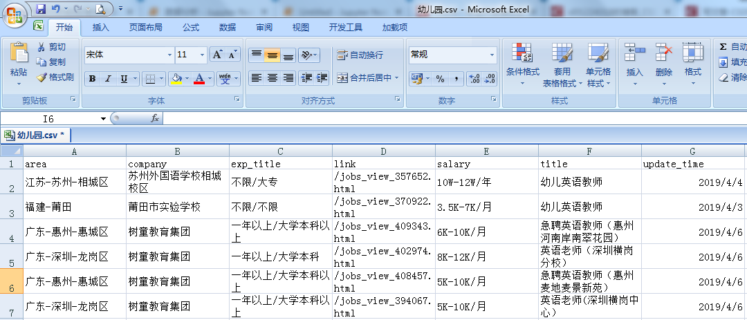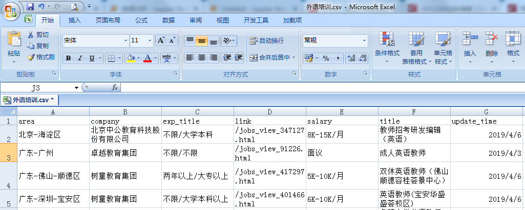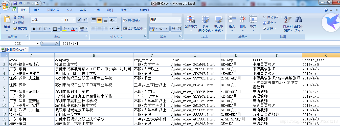 首先我们先看下这几个excel表格,“外语培训”是记录一些培训院校对外语教师的招聘添加、城市、经验和学历要求,“幼儿园”表格是记录幼儿园学校对外语教师的招聘要求,同理“职业学院”和“中小学”也是对外语教师的招聘要求、包括工作经验、学历、薪资等,具体所图所示: