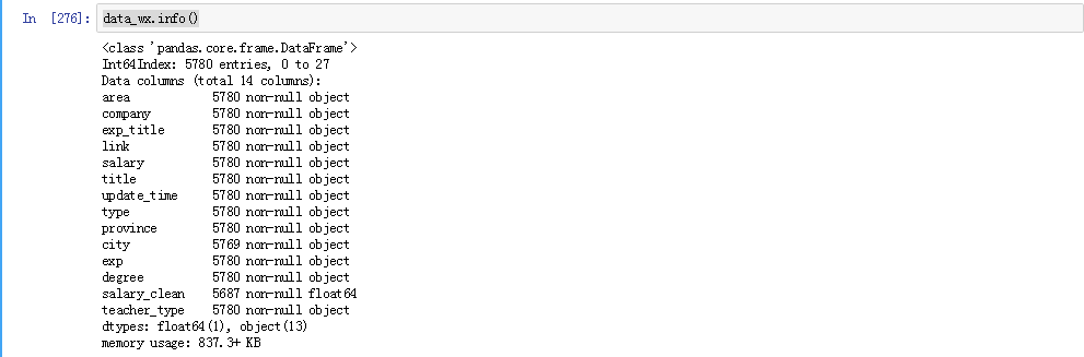 # return (float(low) + float(high))/2*10/12low, high = re.findall(pattern=pat_W, string=data)[0]return (float(low)+float(high))/2*10/12if 'K' not in data and '月' in data:low,high = re.findall(pattern = pat,string = data)[0]return (float(low) + float(high))/2/1000data_wx['salary_clean'] = data_wx['salary'].apply(get_salary)