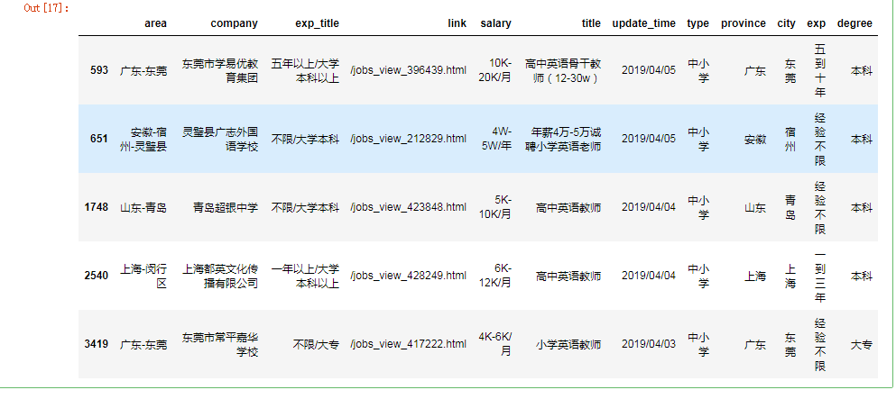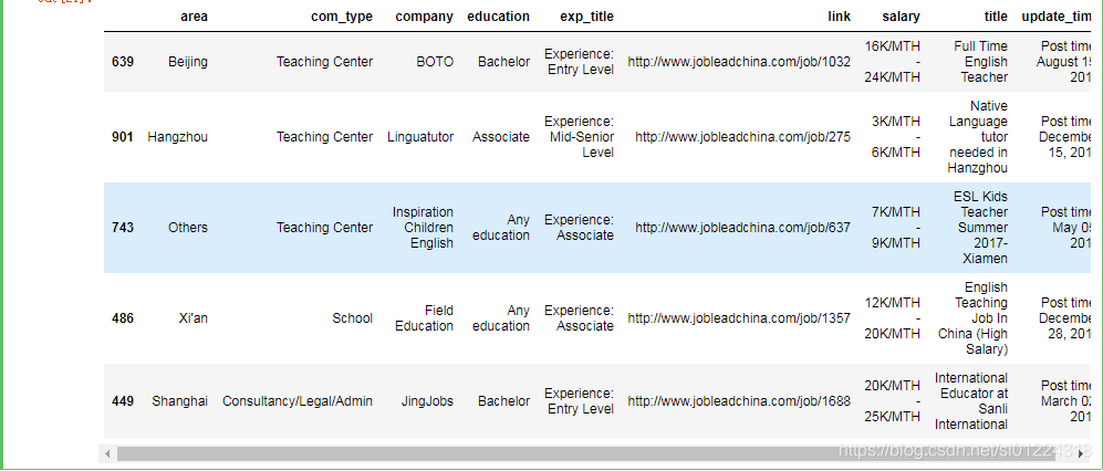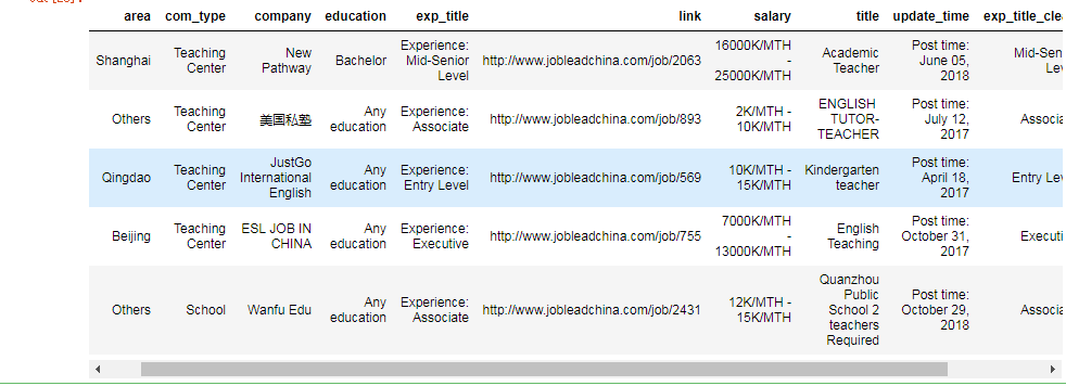 我们上边把我们合并的表格数据已经清洗好了,接下来我们接着对“JobLeadChina”数据进行清洗、整理,我们先看一下数据内容。