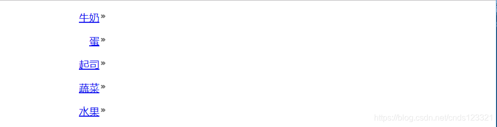<body><ul><li><a href="#">牛奶</a></li><li><a href="#">蛋</a></li><li><a href="#">起司</a></li><li><a href="#">蔬菜</a></li><li><a href="#">水果</a></li></ul>
