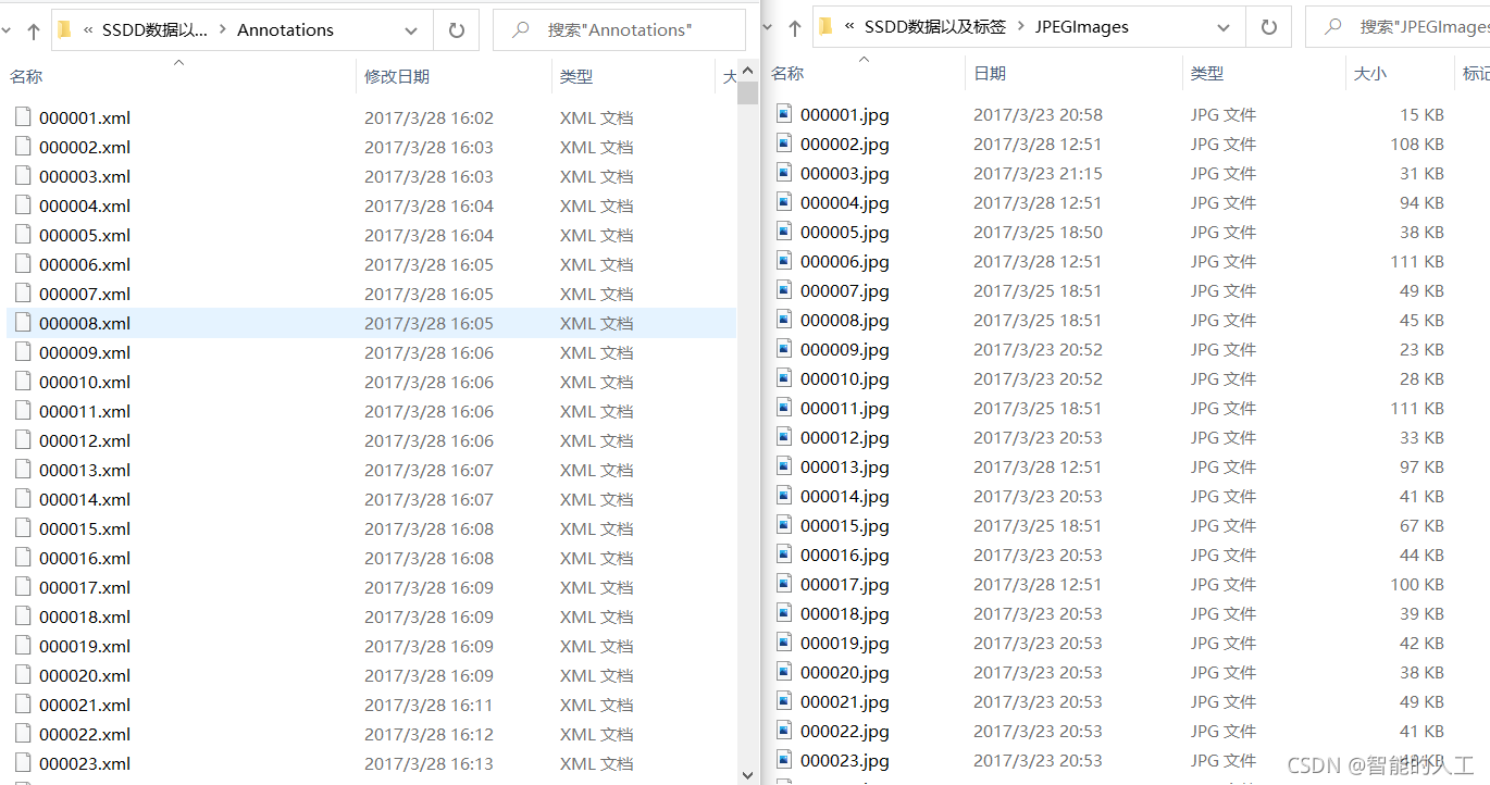 以SSDD舰船检测数据集为例,SSDD数据集包括两个文件夹,一个存放jpg格式的图像块,一个存放xml格式的标注,如下图所示:
