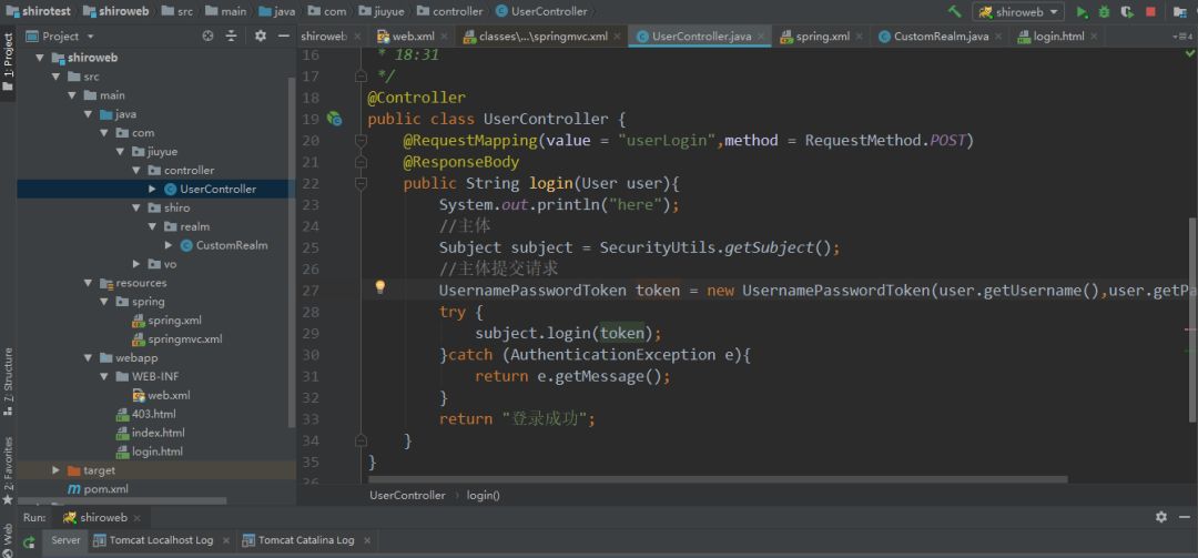 1@Controller2public class UserController {3 @RequestMapping(value = "userLogin",method = RequestMethod.POST)4 @ResponseBody5 public String login(User user){6 System.out.println("here");7 //主体8 Subject subject = SecurityUtils.getSubject();9 //主体提交请求