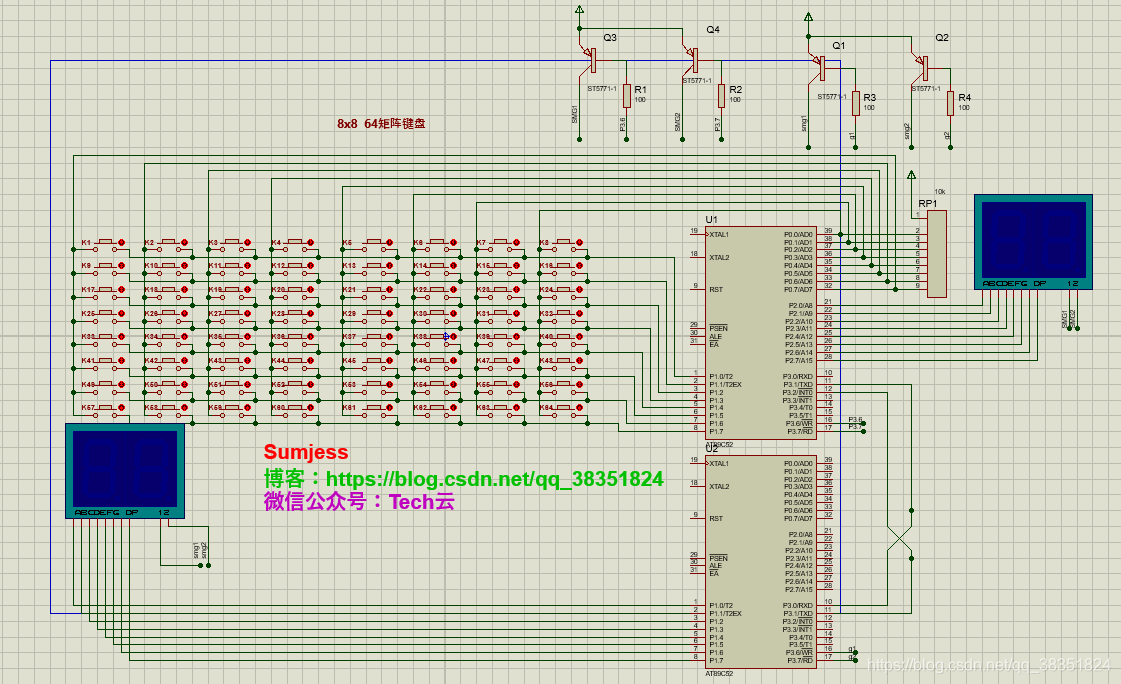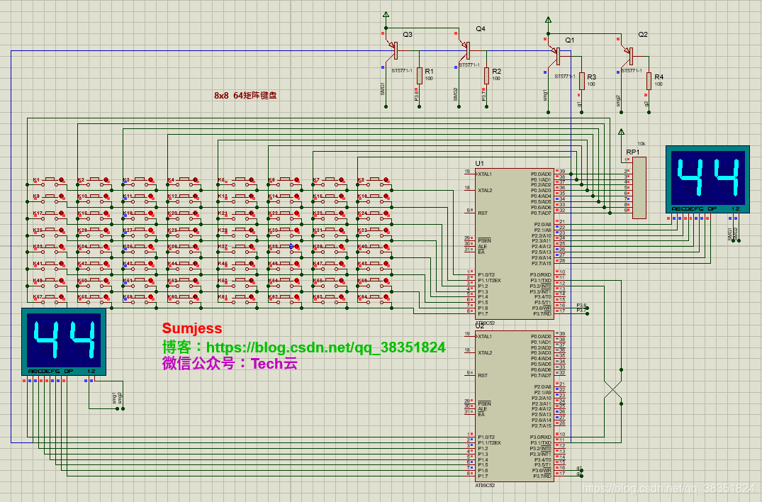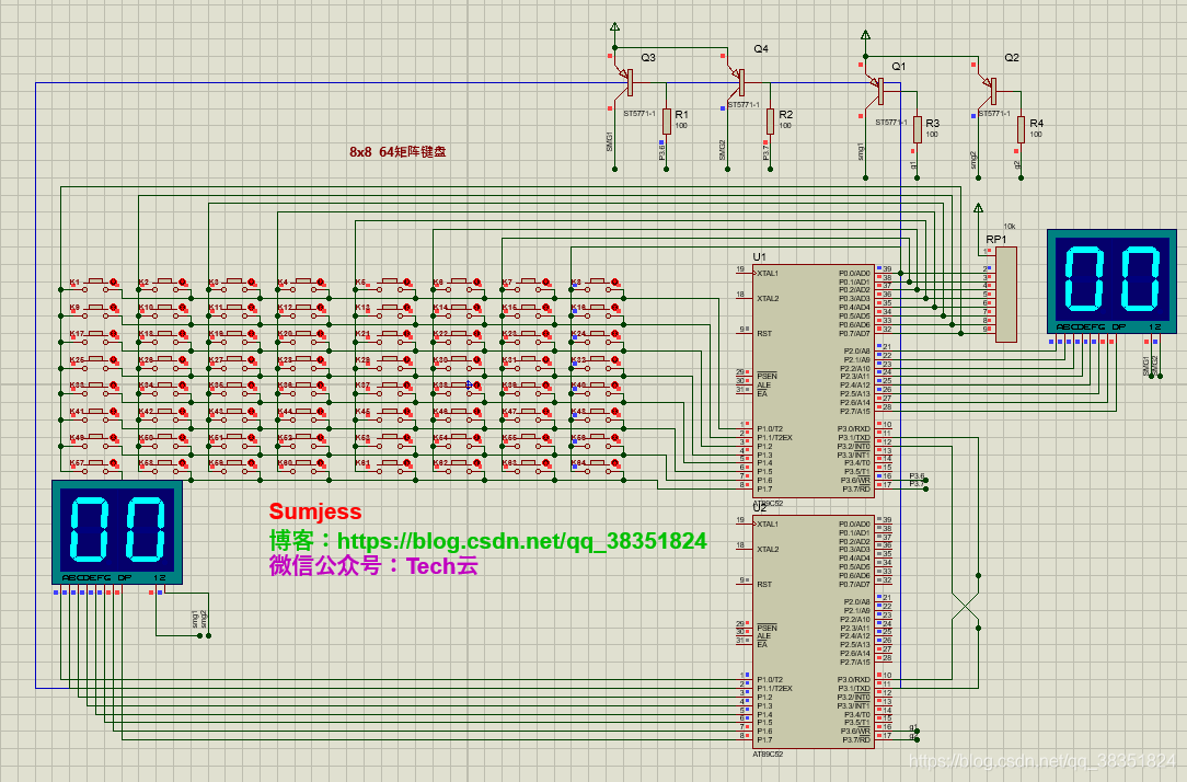 说明: 发送端单片机1程序:8*8矩阵键盘读取数码管显示,再由串口与单片机2进行通信;把单片机1读取的按键值发送给单片机2进行显示