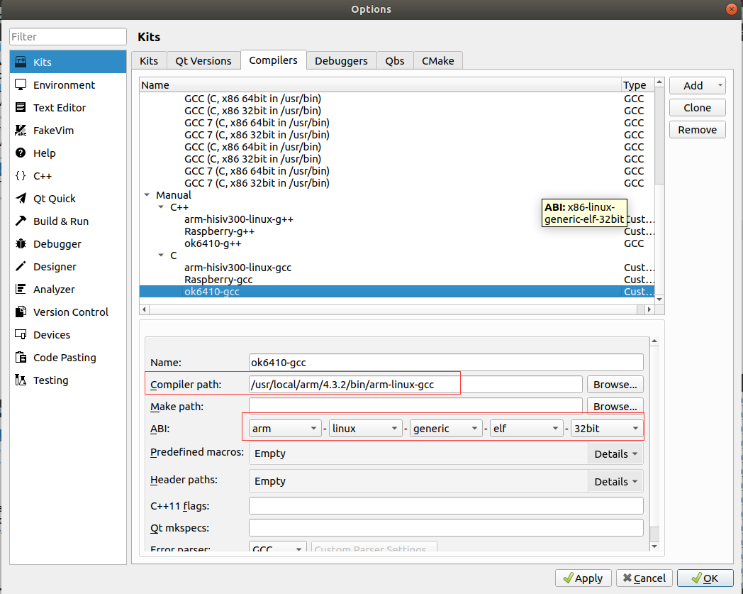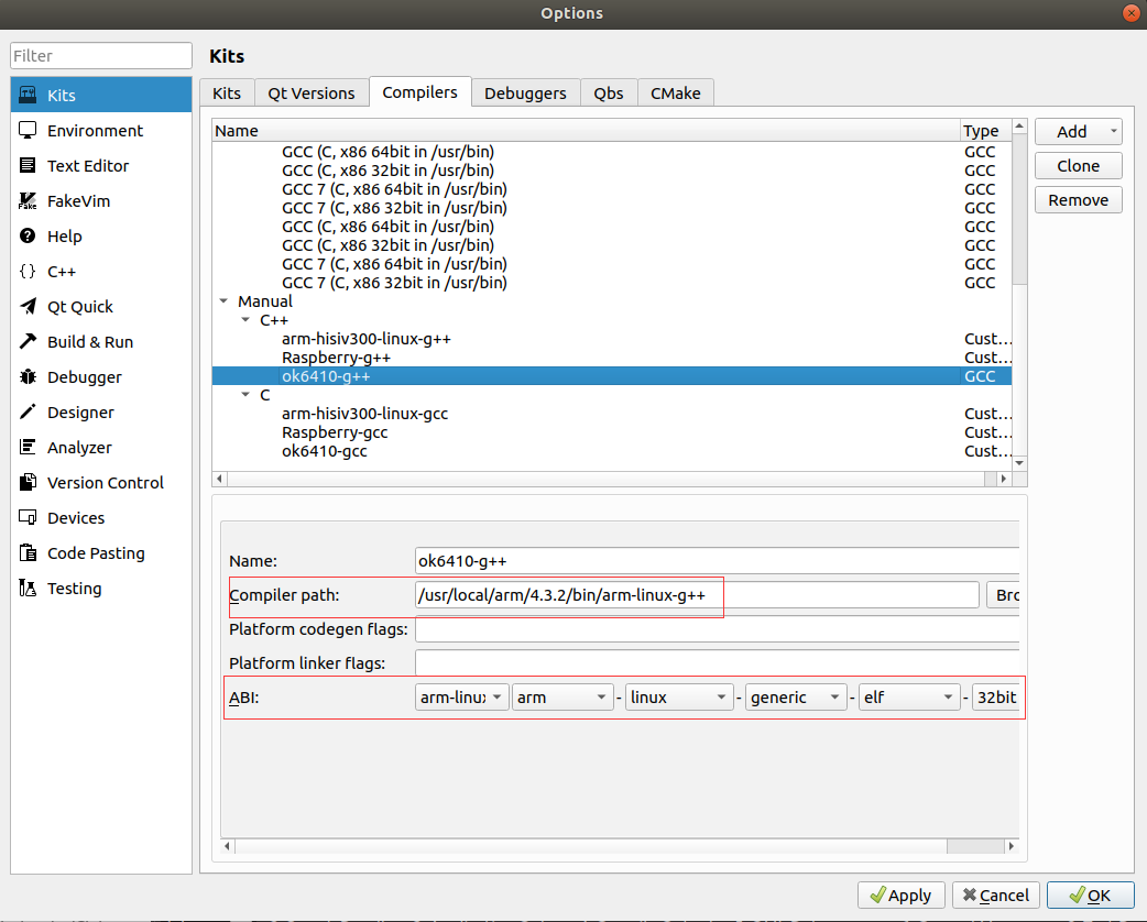 Compiler有gcc和g++都是添加交叉编译工具安装里