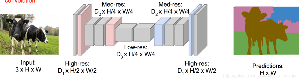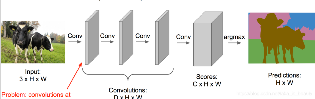 输入3*H*W维度的图像,经过卷积层处理,可以构建一个C个类别的Score:C*H*W的矩阵,输出得分类别最大的一个H*W维度的矩阵!(对像素点维度去做一个分类)