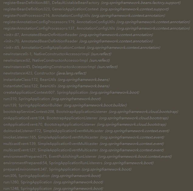 我们只需要在DefaultListableBeanFactory的实现上打个断点就能够看到调用堆栈了,第一次注册BeanDefinition的时机是: