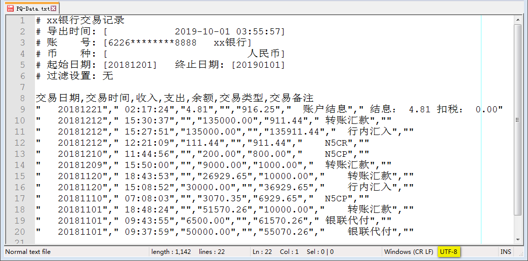 例如某银行网银导出的交易记录文件,如下图所示。