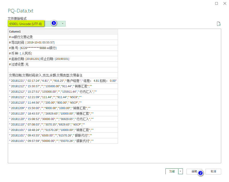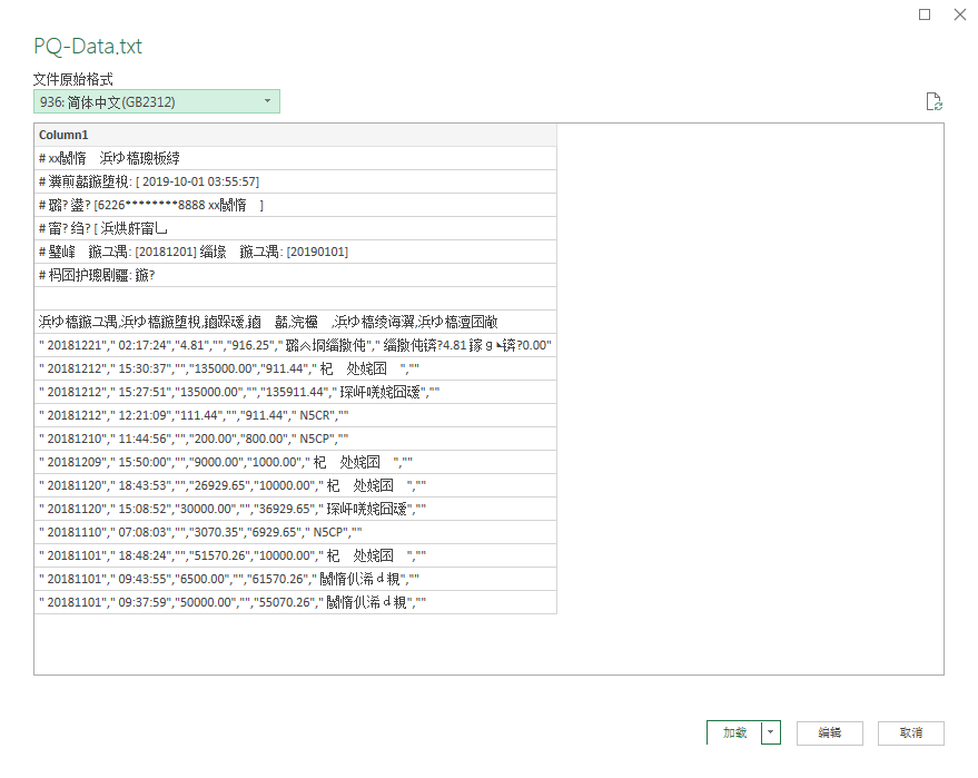 修改文件原始格式为UTF-8,文件内容可以正常显示,但是由于文件前7行的干扰,PQ无法直接识别表格数据,此时需要单击【编辑】按钮在PQ编辑器中进行数据清洗。
