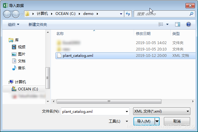 在【导入数据】对话框选择XML数据文件,单击【导入】按钮。