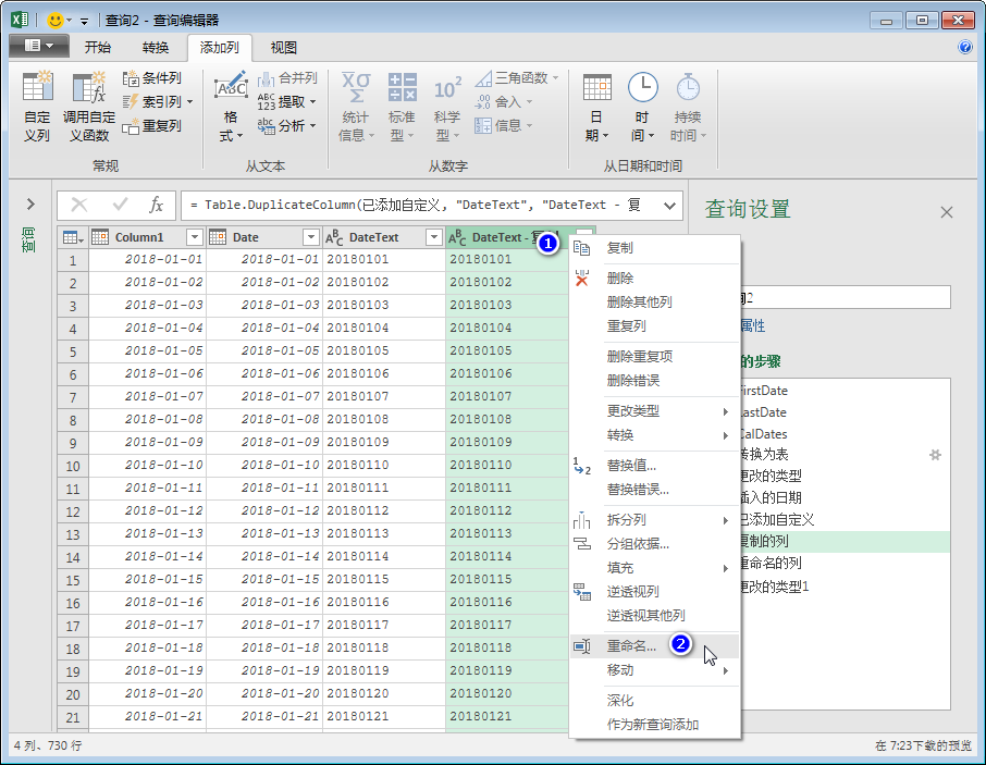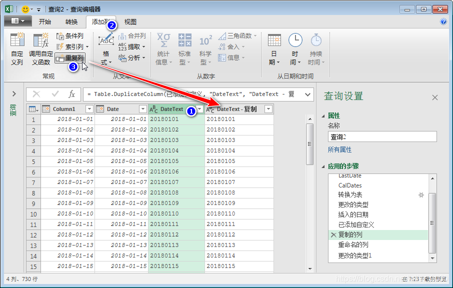 选中“DataText”列(前三列任何一列都可以),依次单击【添加列】选项卡=>【重复列】,将复制指定列添加新列,新列的数据类型与指定列相同,这里是文本类型。