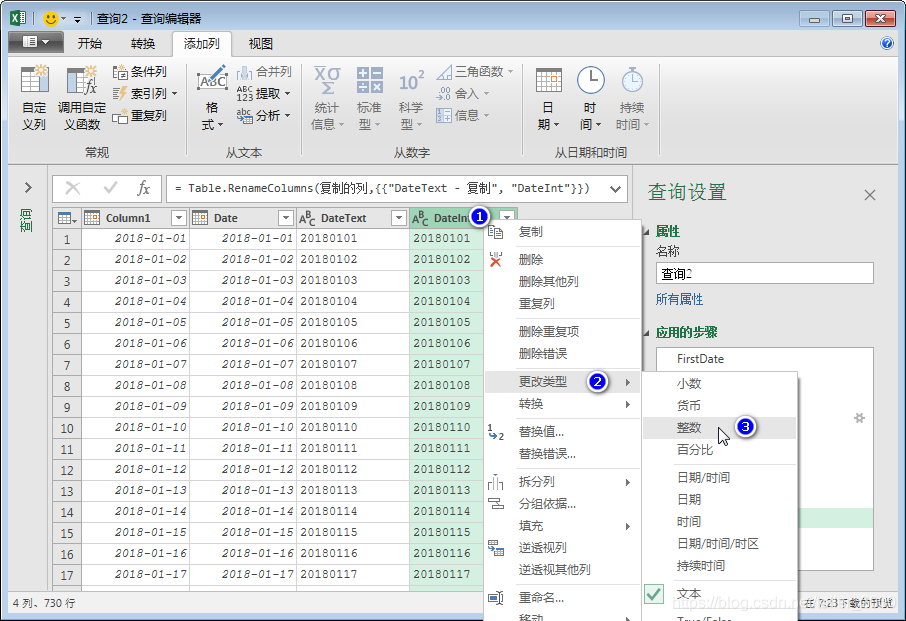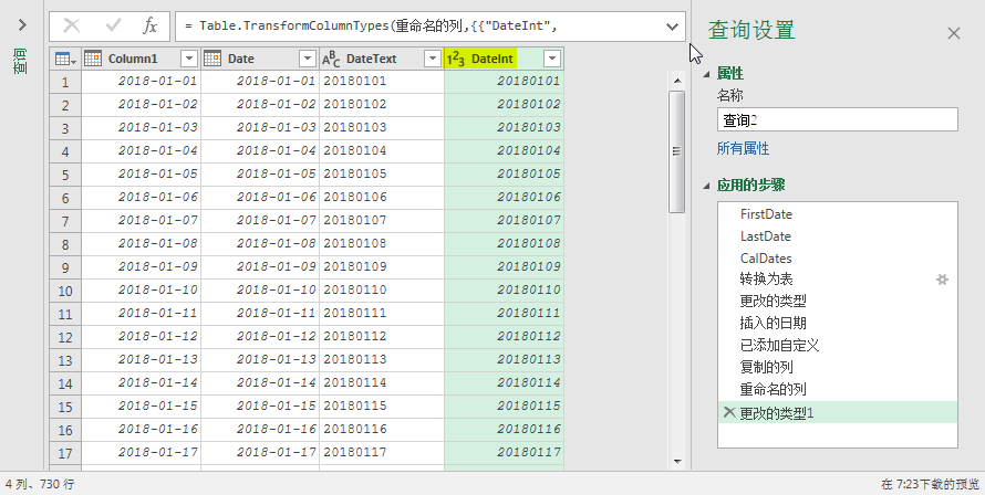 其中第9行代码复制列,第10行代码修改列名,其实这两行代码可以合并为一行,在DuplicateColumn函数中直接指定新列名称"DateInt",如下所示。