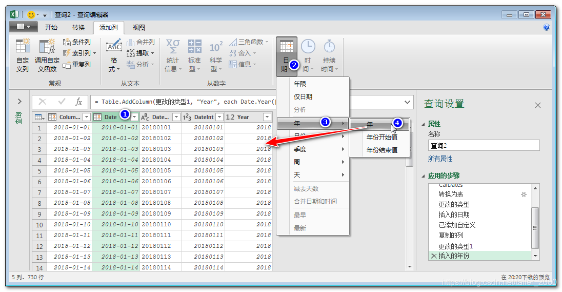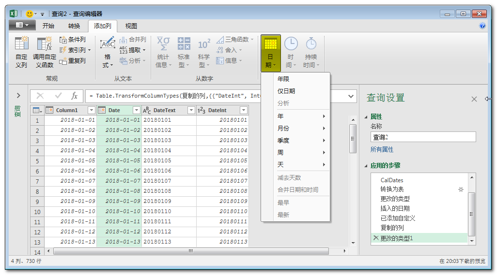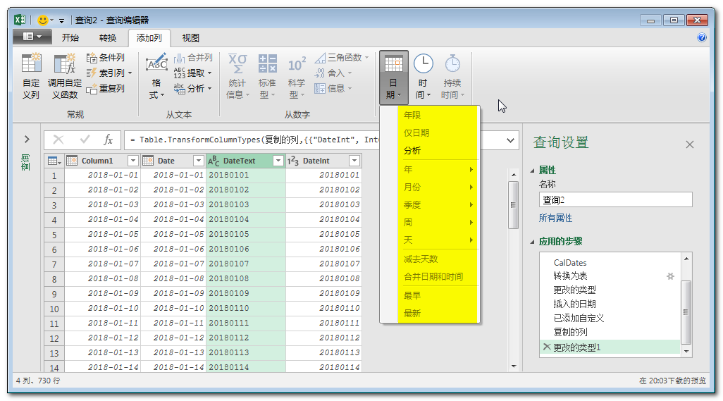接下来讲解一下【添加列】选项卡中【日期】按钮的使用方法。