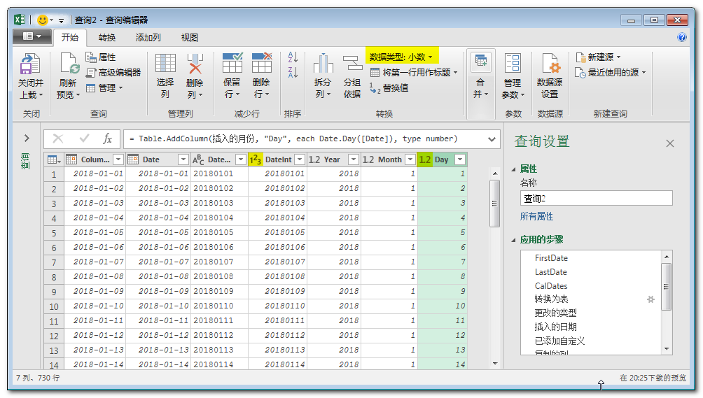 letFirstDate = #date(2018,1,1),LastDate = #date(2019,12,31), CalDates = {Number.From(FirstDate) .. Number.From(LastDate)},转换为表 = Table.FromList(CalDates, Splitter.SplitByNothing(), null, null, ExtraValues.Error),更改的类型 = Table.TransformColumnTypes(转换为表,{{"Column1", type date}}),插入的日期 = Table.AddColumn(更改的类型, "Date", each DateTime.Date([Column1]), type date),已添加自定义 = Table.AddColumn(插入的日期, "DateText", each Date.ToText([Date],"yyyyMMdd"), type text),复制的列 = Table.DuplicateColumn(已添加自定义, "DateText", "DateInt"),更改的类型1 = Table.TransformColumnTypes(复制的列,{{"DateInt", Int64.Type}}),插入的年份 = Table.AddColumn(更改的类型1, "Year", each Date.Year([Date]), type number),插入的月份 = Table.AddColumn(插入的年份, "Month", each Date.Month([Date]), type number),插入的某一日 = Table.AddColumn(插入的月份, "Day", each Date.Day([Date]), type number),插入的季度 = Table.AddColumn(插入的某一日, "Quarter", each Date.QuarterOfYear([Date]), type number),插入的每年的某一周 = Table.AddColumn(插入的季度, "WeekOfYear", each Date.WeekOfYear([Date]), type number)