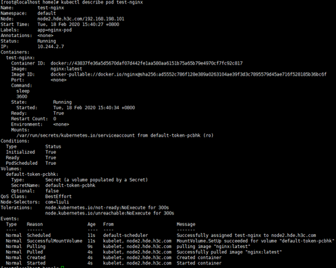 可以看到 Events 下面的信息,我们的 Pod 通过默认的 default-scheduler 调度器被绑定到了node2节点。不过需要注意的是nodeSelector属于强制性的,如果我们的目标节点没有可用的资源,我们的 Pod 就会一直处于 Pending 状态,这就是nodeSelector的用法。