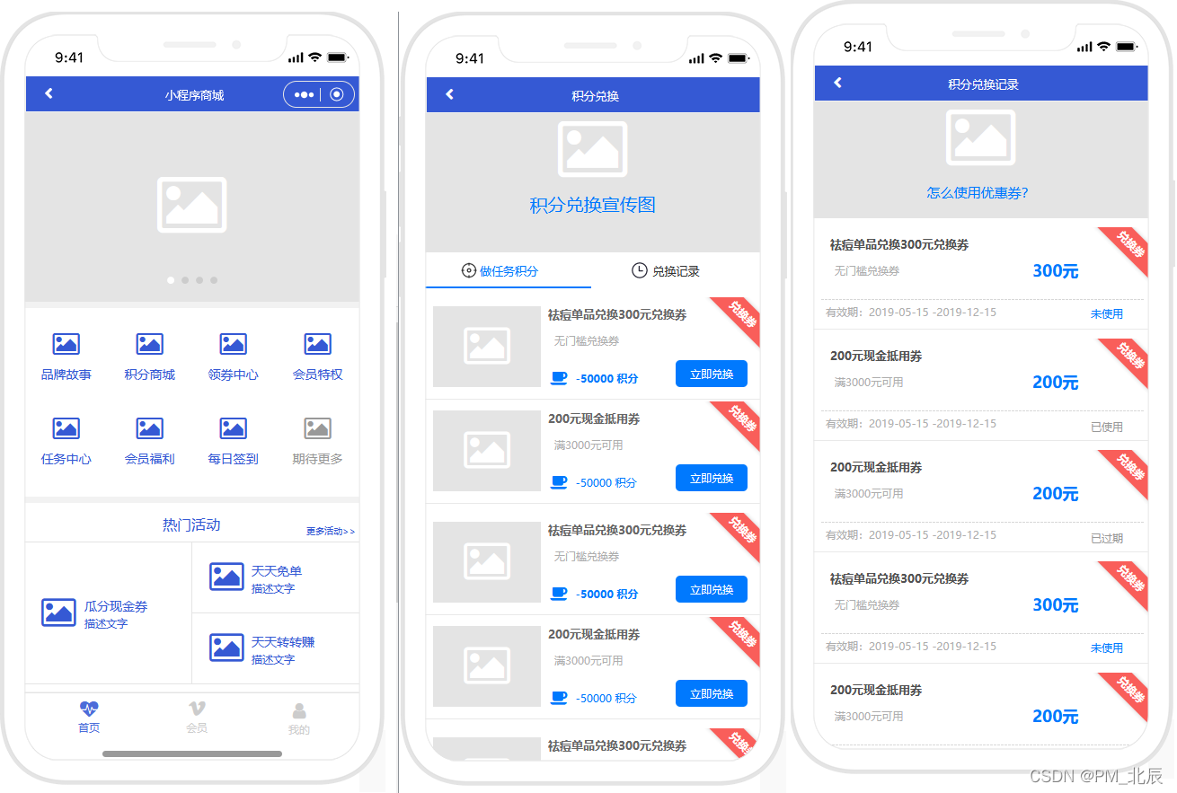 商城小程序、实例原型设计、电商app、积分商城、领券中心、会员中心、每日签到、小程序电商、优惠券、移动端电商、Axure原型、rp原型、产品原型、积分、会员卡