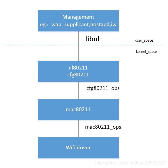 我们可以看出,各个模块之间的界限清晰,模块之间透明不可见,模块之间一般不会相互影响。本章重点关注是iw----(netlink)----cfg80211这部分的实现,其他模块以后的章节来详细说明。最终关注的还是层与层之间的收发函数。