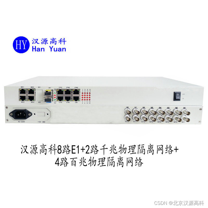 8路E1+2路千兆物理隔离网络+4路百兆物理隔离网络光端机是汉源高科(北京)科技有限公司采用自主知识产权的大规模集成电路,应用时分复用技术,将2路物理隔离的千兆以太网信号、4路物理隔离的百兆以太网信号和8路E1信号混合编码后在一对光纤上传输。实现10/100以太网业务、10/100/1000M以太网业务和8路E1业务混合传输。该机采用19英寸、1U机框设计,集成度高,体积小,功耗低,工作可靠,安装使用方便。