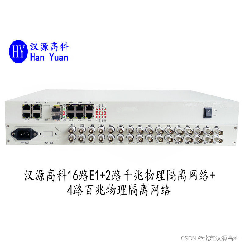 16路E1+2路千兆物理隔离网络+4路百兆物理隔离网络光端机是汉源高科(北京)科技有限公司采用自主知识产权的大规模集成电路,应用时分复用技术,将2路物理隔离的千兆以太网信号、4路物理隔离的百兆以太网信号和16路E1信号混合编码后在一对光纤上传输。实现10/100以太网业务、10/100/1000M以太网业务和16路E1业务混合传输。该机采用1916寸、1U机框设计,集成度高,体积小,功耗低,工作可靠,安装使用方便。