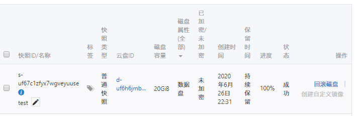 创建快照(包括数据盘快照和系统盘快照,系统盘快照可生成自定义镜像)和快照的回滚。