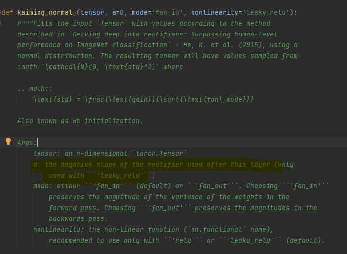 torch.nn.init.kaiming_normal_(tensor, a=0, mode= 'fan_in', nonlinearity='leaky_relu')