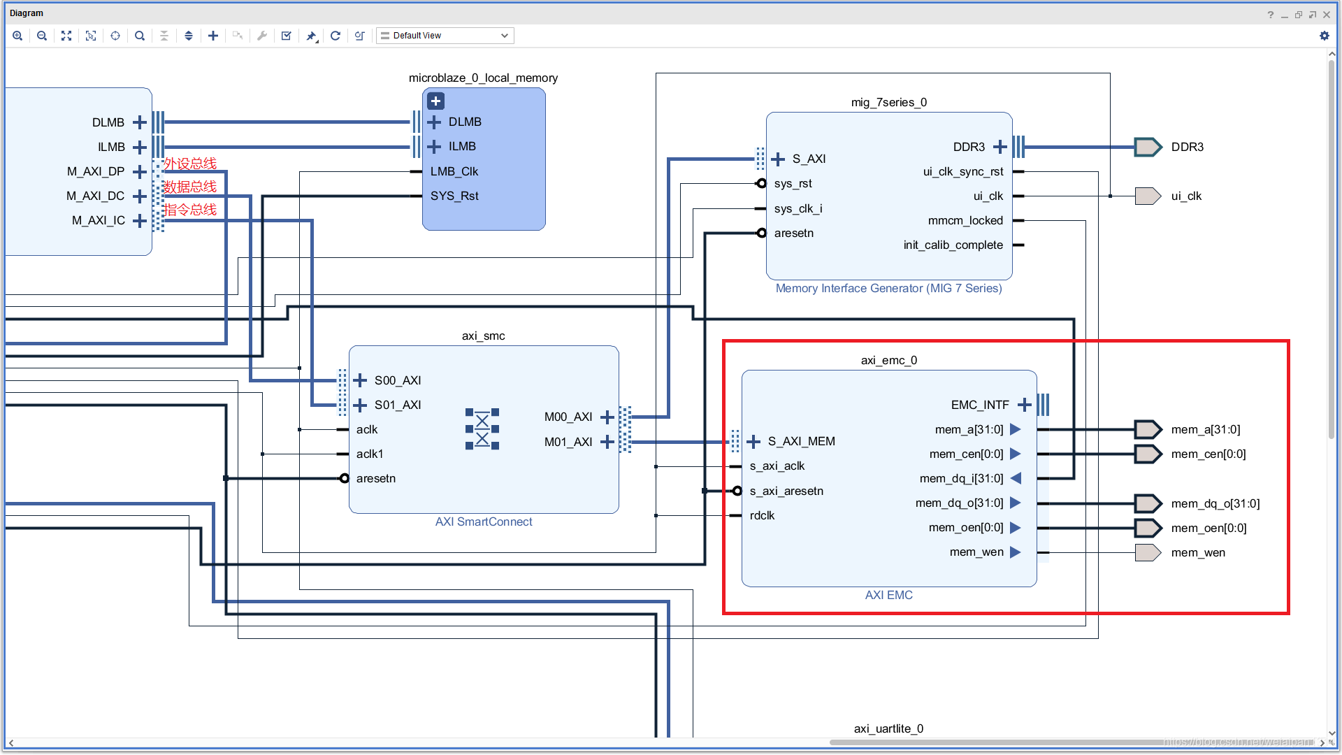 我们在来看看地址分配图,其实Vivado自动生成的电路图吧EMC接到了IC上和DC总线上,Vivado会以为用户会接内存,来运行程序用的: