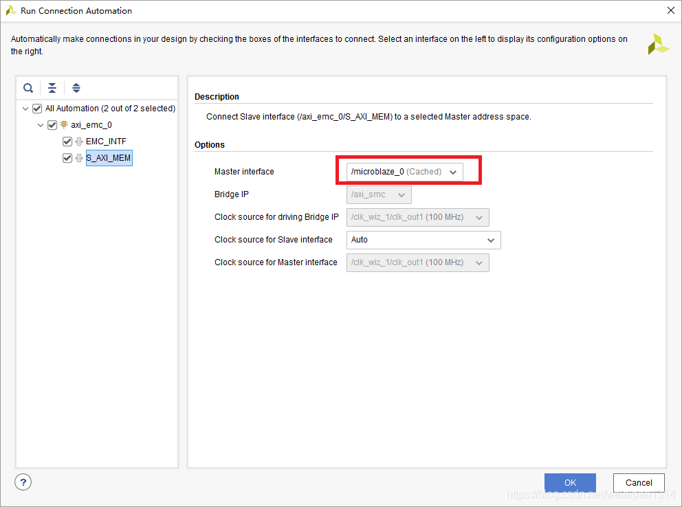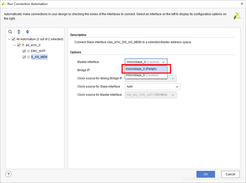 在自动生成原理图的时候,需要核对AXI类型IP核是需要接到哪个总线上,外设需要接到外设总线上,内存是需要接到内存总线上,如下图修改,选种点击OK即可: