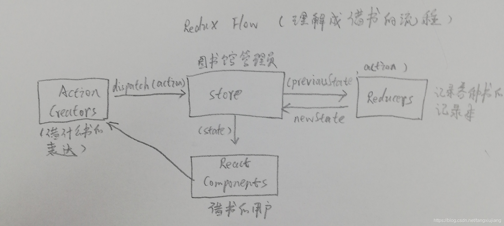 <input onChange={this.handleInputChange}>handleInputChange(e){//创建action//input(React Component)框告诉store要做的action(Action Creators)const action={type:'change_input_value',//可以将input的value传递过去value:e.target.value}//组件将action传给store对象store.dispatch(action);
