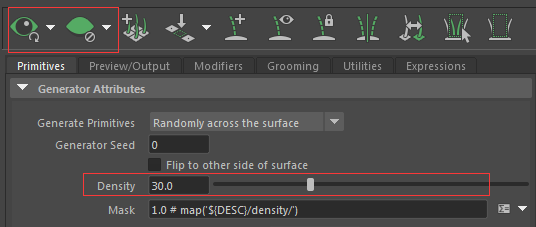 同过XGen面板:Primitives、Generator Attributes、Density属性可以看到头发生成,如果看不到头发,点击Update XGen Preview,如果希望隐藏掉头发,则点击Clear XGen Preview(就是两个眼睛按钮,一个开,一个闭)