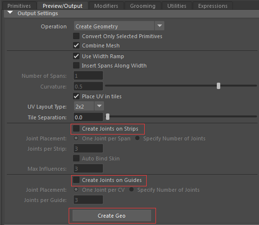 2)在XGen面板Preview/Output、Operation选择Create Geometry,并且(如果不需要为每根头发都创建骨骼)取消两个Joints选项,再按Create Geo,就会生成新的Mesh
