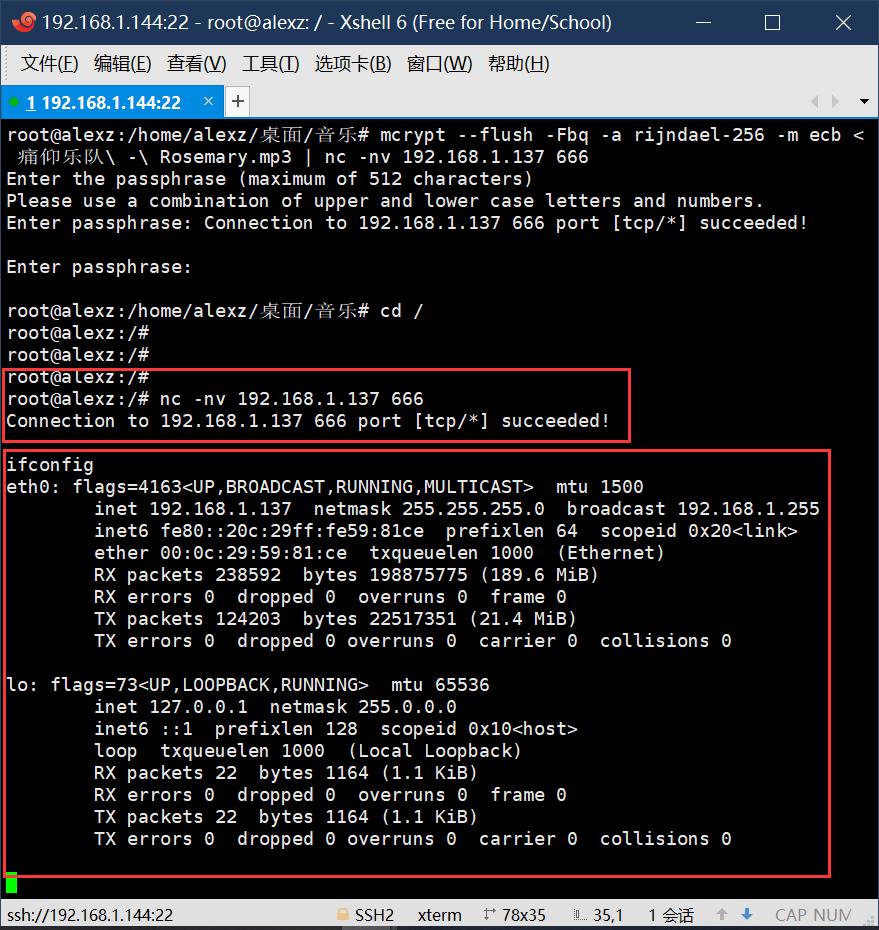 mcrypt --flush -Fbq -a rijndael-256 -m ecb < 痛仰乐队\ -\ Rosemary.mp3 | nc -nv 192.168.1.137 666