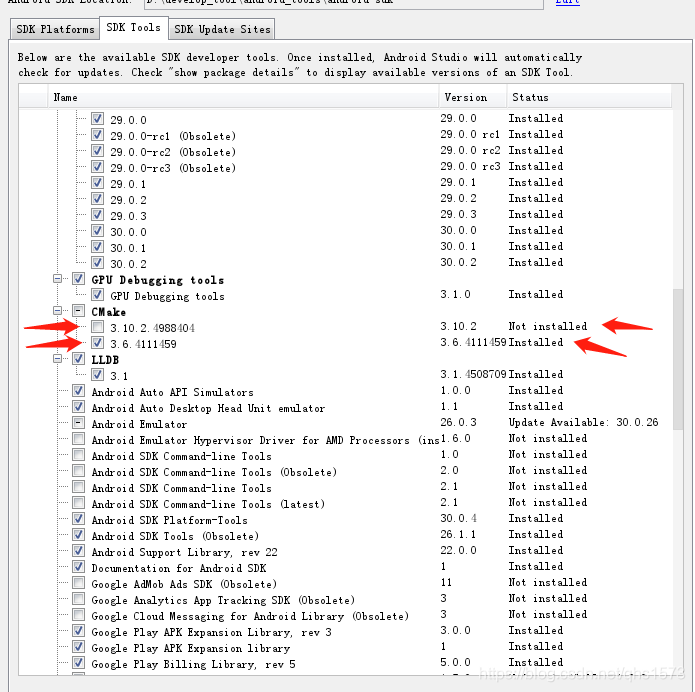 当时很郁闷,然后搜索发现大家说Cmake不兼容导致的,突然间十万个CNM崩腾而过,干嘛手贱更新的,然后下载最心的AndroidStudio结果发现问题还是没解决一样报错,然后我心想既然更新了我就把他卸载得了然后我就找到SDK下的CMake删除了一个就好了,具体请看截图: