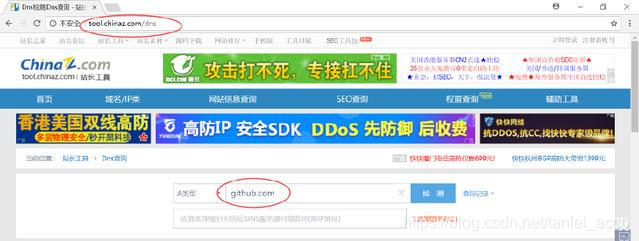 b、在浏览器中打开DNS查询网站http://tool.chinaz.com/dns,我们输入github.com,如下图所示: