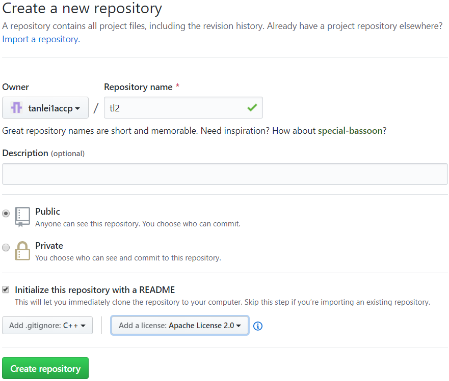 public表示公有库,也就是说任何人都可以看到你的仓库信息。private表示私有库也就是只有你自己才可以看到和使用的仓库。Initialize this repository with a README表示要使用README创建一个初始化的仓库,下面左侧的下拉框表示忽略的内容,这里选择C++,而右侧的下拉框表示遵循的协议,在这里选择Apache License 2.0 -